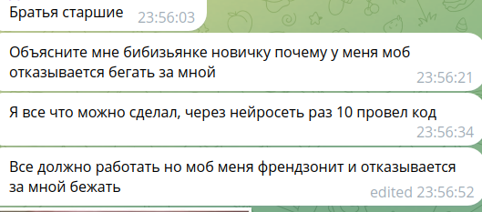 Спасибо популяризаторам за трафик крови, которая ничего не умеет, ничего не хочет и не будет импрувиться, в коммьюнити. Контрибутите в то, чтоб персонажи типа пикрил встречались еще чаще. Шоб вы понимале, на пике весь изначальный контекст проблемы. "Моб" "отказывается" "бежать" за "игроком", разберитесь кто-нибудь. Ну и упоминание нейроночки как вишенка на торте. Через 14 часов там еще узналось, что код списывался из какого-то курса на русском) на ютубе. Тоже тот еще рак, литературно воронка для айпад кидов в вайб кодинг геймдев пайплайн