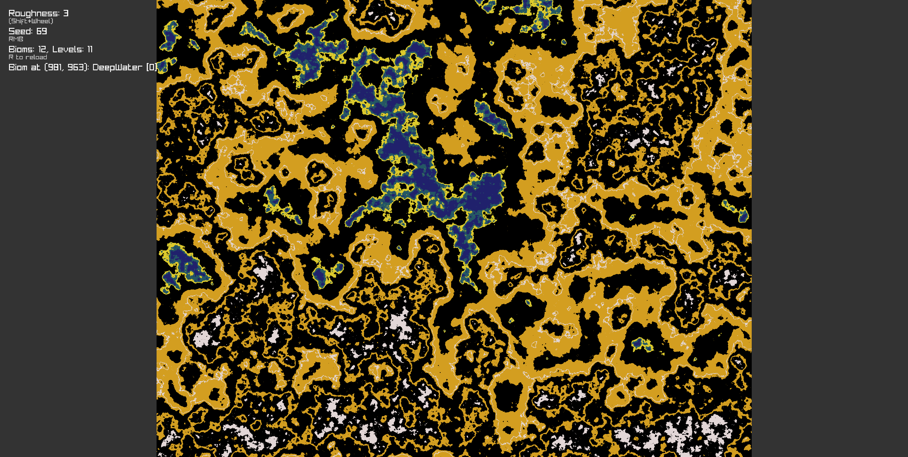 Например, если значение шума в пикселе от 0 до 255, мы можем сказать что от 0 до 50 будет вода, от 50 до 80 песок, потом трава и т.п. Так мы получаем "карту". Ну а дальше уже рендерим как-нибудь. Я пока что просто рендерю тайлы с переходами.