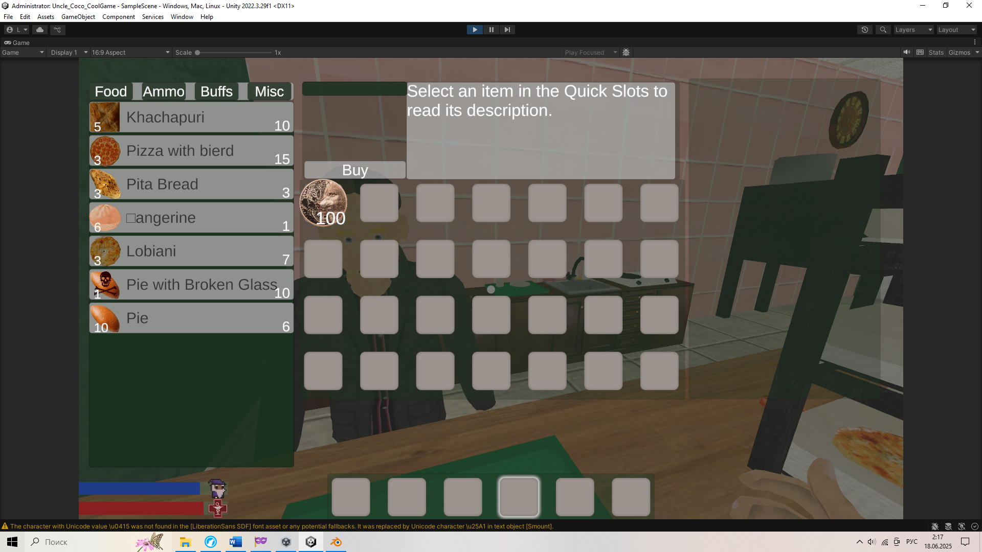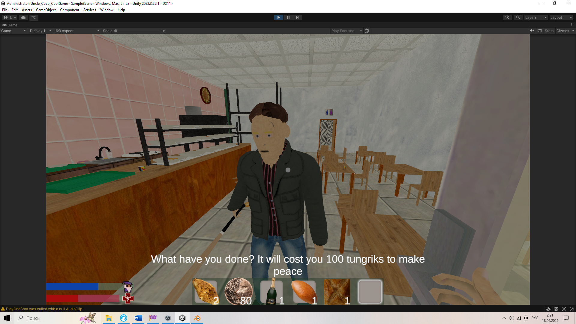 >>1025786 Последнее время увы очень занятой(+я плохо умею в тайм-менеджмент) поэтому похвастать особо нечем. Сделал чуть моделей, добавил систему торговли (можно покупать и продавать и у каждого торговца есть определённый типа вещей который он может купить). Ещё сделал возможность помириться с нпс которому мы дали по морде. А и ещё добавил всплывающие подсказки внизу экрана. Ну из значимого вроде всё. Продолжаем продолжать!