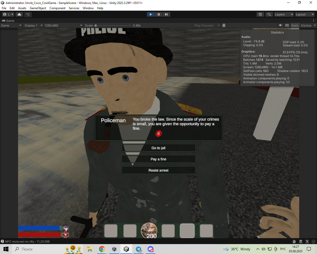 >>1040917 Добавил возможность заплатить штраф при помощи специального терминала. Такая возможность присутствует, если уровень criminalShitValue не превышает определённое значение. Также провёл багфиксы чтобы полицаи могли работать вместе и не мешать друг другу. Сейчас думаю займусь моделингом зданий, чтобы у нпс были домики или места для обитания, куда они будут уходить. К примеру бандюганы будут по ночам слоняться по улицам, а днём зависать в каком-нибудь баре "воровской закуток". А и ещё сделал чтоб у разного оружия было разное время стана, так можно будет добавить больше разнообразия