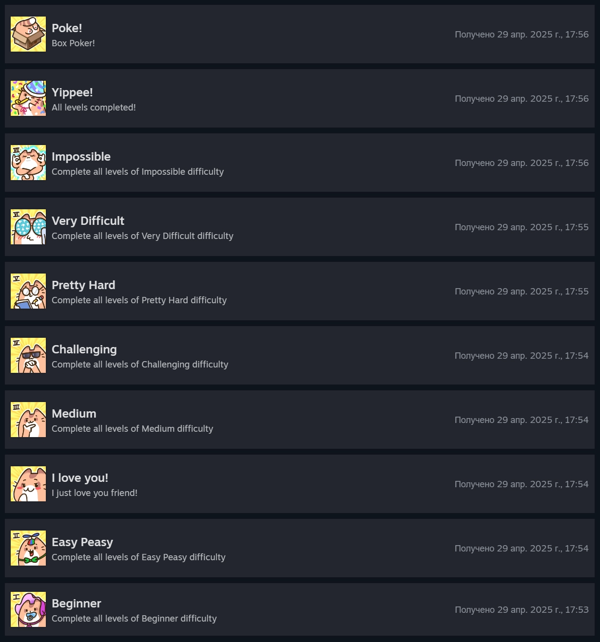>>1019057 Нет не нейронка, котики ручная работа на планшете, описания сам писал, музыку тоже сам писал) Код когда пишу иногда пользуюсь ИИ потому что в кодинге мало опыта. Я делал браузерки, но захотелось попробовать стим с небольшим проектом, вообще дальше после этой игры про котиков хочу сделать ещё головоломку типа A Little To The Left, сам бывает залипаю в подобное много %) а после хочу хоррор сделать, начал даже писать сценарий %) Хотя сочетание странное конечно %) Спасибо за интерес и совет)