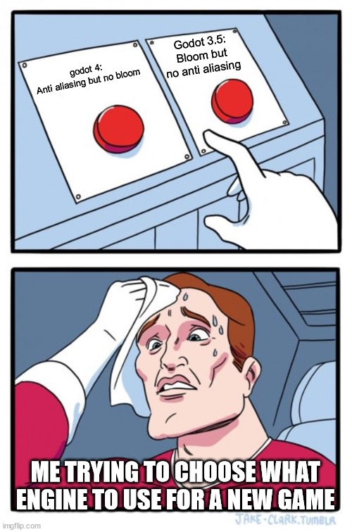 >>1026578 Благодарю за отзыв. В целом я изначально прицелился именно на годот, но мне кажется я пососу с производительностью, поскольку все подобные моей игры сделанные на движке сосут, а на фреймворках не сосут. Примерно так.