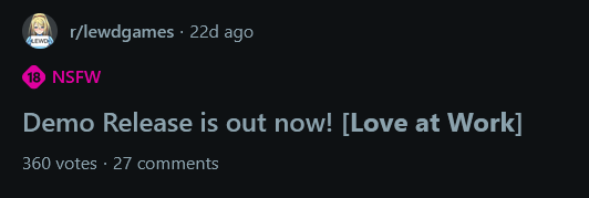 >>1028207 Я не он, но могу предложить, что при сортировке игр в определённом теге (NSFW, porn, adult...) самые новые оказываются вверху и получают клики. Если игра уже популярная, она будет ближе к верху по сортировке по популярности. Если игра старая и непопулярная, она, очевидно, утонет в списках при любой сортировке.