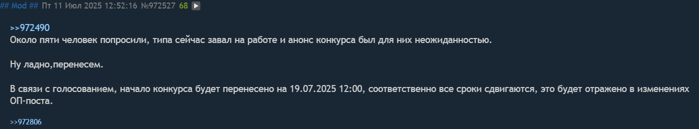 >>1031357 (OP) >Аноним >11/07/25 Птн 00:49:30 >С 12 по 26 июля 2025 года будет проведен конкурс Что за рофлоанонс за день до начала?