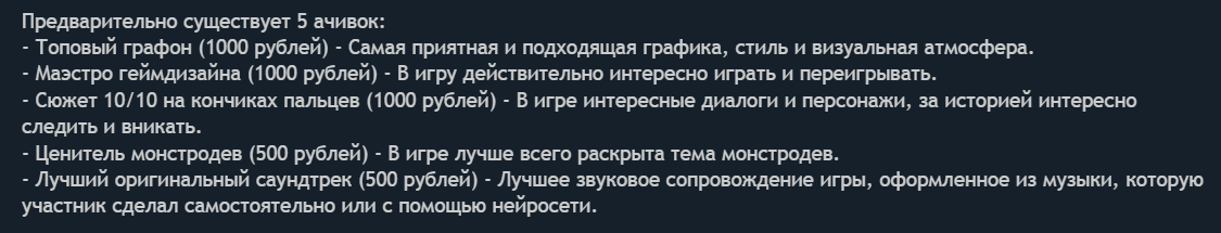 Список всех ачивментов публикуется вместе с темой конкурса. Предварительно существуют 4 ачивки: Топовый графон (1000 рублей) - Самая приятная и подходящая графика, стиль и визуальная атмосфера. Маэстро геймдизайна (1000 рублей) - В игру действительно интересно играть и переигрывать. Сюжет 10/10 на кончиках пальцев (1000 рублей) - В игре интересные диалоги и персонажи, за историей интересно следить и вникать. Ценитель монстродев (500 рублей) - В игре лучше всего раскрыта тема монстродев. Лучший оригинальный саундтрек (500 рублей) - Лучшее звуковое сопровождение игры, оформленное из музыки, которую участник сделал самостоятельно или с помощью нейросети.