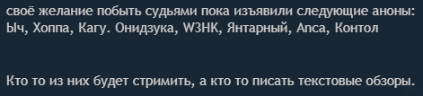 Из известных тут: Ыч, Хоппа Мелкостримеры: ЛеоОнидзука, Янтарный, W3HK, KAGU. Запасной мелкостример если его команда не будет участвовать: ZedUp Текстовые обзоры: Kontol, Anca, FailDevil