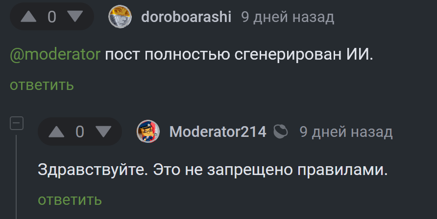 >>1032296 Ой, годотя лопнула, и как же я насрал? Тем что поплакал што заебался рисовать? А когда фольгаголовые начали мне за ии пояснять сказал что их призераю? Или насрал тем что попросил палитру от анона? Или насрал тем что назвал нейронюфажу нюфажей который с чегото решил что тред исключительно для обсуждения вокота и его любимого ии? А знаешь чому мне сняли бан спустя минуту после малявы в мочерскую? Тому што я никакого движкосрача и темболее вайпа неразводил. Но годоте хоть ссы в глаза все божья роса. Если раньше в вокот треде можно было лампово поразганять с анонами, то сейчас это буквально местообитание фольгаголового ии рака. Хуй я туда больше зайду и темболее напишу, что и другим советую. >>1032297 Это я и завайпал. Нелюблю вниманеблядей которые своим мимокрокским ебальником необосновано светят. А вайпать я началь только после того как эта шлюха решила из треда устроить блог своей личной жизни, если ты не заметил. Только не надо это ровнять с твг, буквально другое.