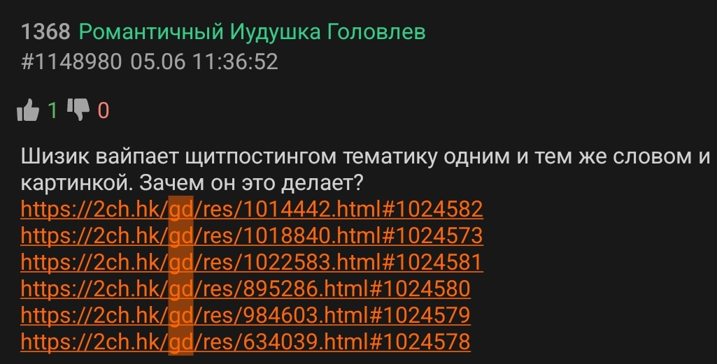 Добавлю к >>1032137 - вся суть действий этого персонажа в том, чтобы его обсуждали. Не будет реакции на одну вебем - он запостит 10, лишь бы кто-то увидел и ответил что-то, пусть даже негатив. И так уже почти 10 лет. Я к сожалению и сам его обсуждаю сейчас и отчасти ему потакаю, но это только чтобы дать контекст. Его банят, он передергивает роутер, и срет дальше. Чистят посты - он высирает х2 от вычищенного. Ебаная раковая опухоль доски.