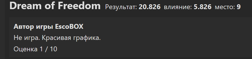 Блять, как вы заебали Просто сделайте катсцену в конце, как ваш гг просыпается Все орги всегда заочно пидарасы, а судьи хуесосы, голосования говно, система оценивания кал Всегда так было на твг и всегда так будет Давно уже пора смириться