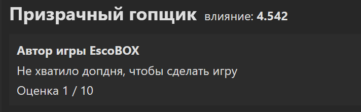 1. Нету кнопочки "режим струмлера": 0.9 2. Нету вообще никаких настроек: 0.9 3. Прямо в заставке начинает орать копирайченный музон: 0.5 4. Мне дают страйк из-за вашей игры: 0.1 5. Каждое сообщение зрителей во время вашей игры: +0.01 к множителю