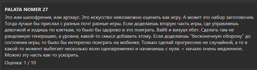 Нету времени нихуя делать, но пиздец как хочется что-то сделать. Придумываю что-то люто примитивное по механикам, что можно было бы быстро доделать в полноценную игру.