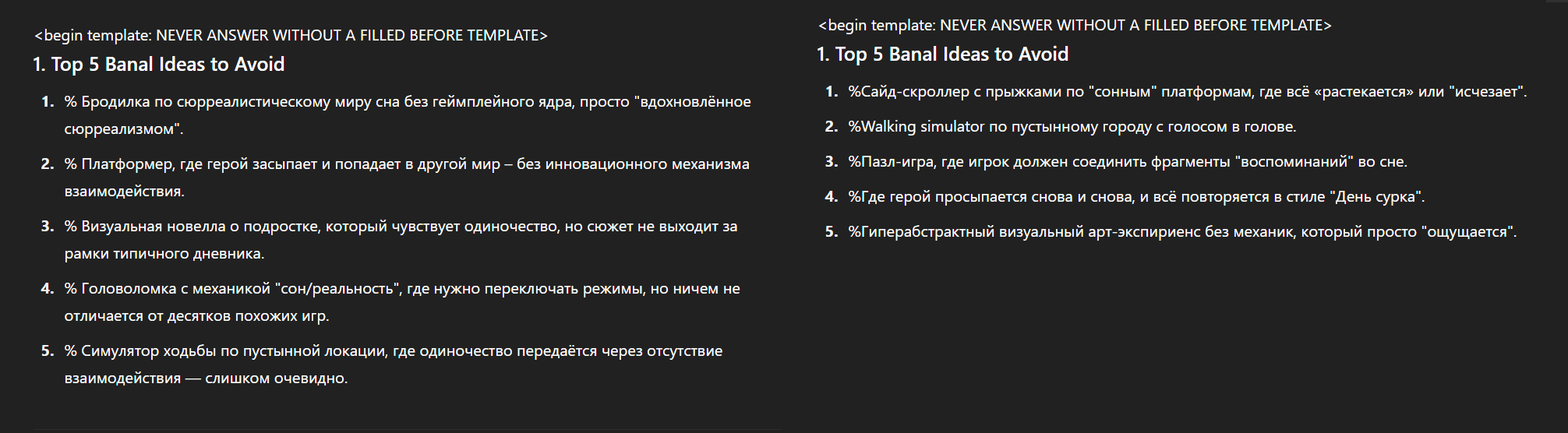 >>1035804 Гпт 1 картинку в день бесплатно рисует, за две недели 14 получится, хорошо если удачных. Да и просто пиздеть с ним бесплатно долго не выйдет, недавно въебали конский кулдаун по полдня после нескольких сообщений, а 4.1 просто тупица, он мне вчера в продолжение беседы о годоте, когда норм нейронка отлючилась, вместо гд скрипта выдал код на жсе вперемешку с крестами (я блядь ваще хз как так), да еще и гордо пометил как гдскрипт. Алсо, даже если на это все забить логика была нерабочая в скрипте. Корчое 4.1 гпт наверно самая тупая из возможных моделей. Я делаю не на юнити, т.к. она у меня даже не запустится.