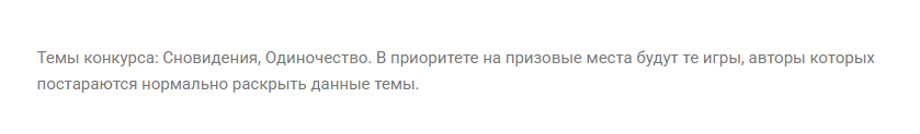 Темы конкурса: Сновидения, Одиночество. В приоритете на призовые места будут те игры, авторы которых постараются нормально раскрыть данные темы.