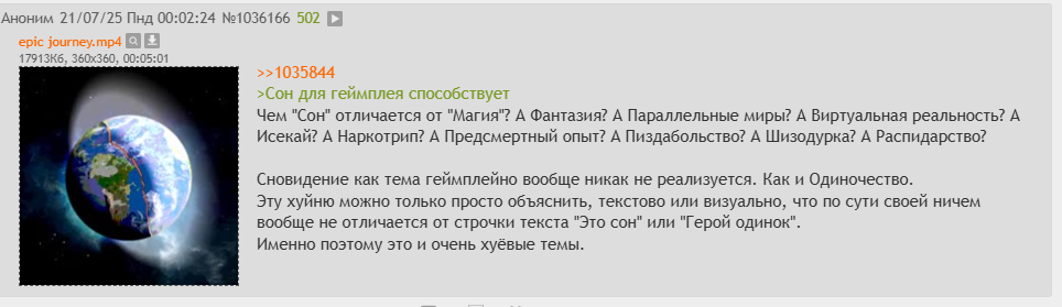 >>1035389 → >Тема это не заградительный барьер от дебилов. Тема это то, что надо раскрыть. >>1035903 → >Я организатор, я выбрал тему. Так же знаю какой анон предложил тему. Очевидно мне и тому анону лучше знать. >Тема не должна ограничивать, тему нужно раскрыть. Творец способен её раскрыть через геймплей или сюжет. О великий взрослый орг, сделавший миллиарды игр, а не поехавший школьник максималист, расскажи нам как ты бы РАСКРЫЛ такие многогранные темы, о рахат лукум моей души.