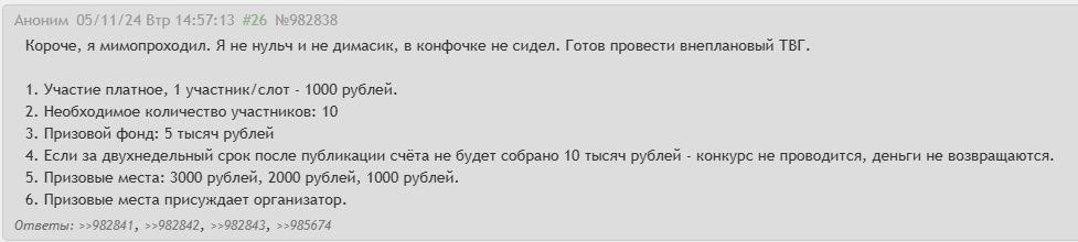 >>1039000 А главное что клоун-то безобидный, единственное плохое что он сделал это о ужас зарепортил тред с рекламой параши. Который репортили еще 10 человек, но почему-от никто охотой на этих крыс не занимается. А они до сих пор итт вякают, правда моча их уже игнорит и наоборот закряплеяет треды. Попытку же проведения ТВГ-Е (1) можно считать положительным вкладом, там особых обсеров не было. Ну ок, еще спорные правила про запрет своих протыков Флеше и Распидоров - ну так Хуеслав почти то же самое сделал, только в слегка более мягкой форме, и поимел успех.