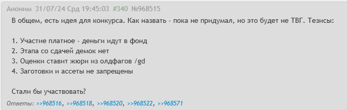 Задача конкурса - сподвигнуть анонов на свою первую игру, на геймдев. Какого-то суперкачества от игр мы не ждём. Мы надеемся на спокойный формат конкурса, без великих драм и срачей. Не беспокойтесь, ваша игра не останется незамеченной.