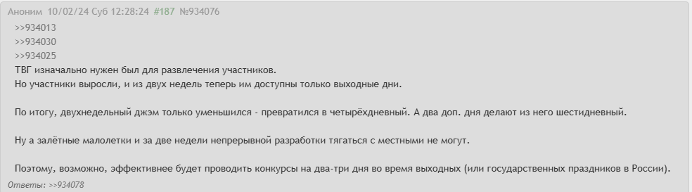 >>1038852 не раскачивай лодку ТВГ. проебать конкурс, имея 7+ дней на запил игры - главная скрепа ТВГ. разные орги вводили любые даунские и тролльские правила, но это святыня