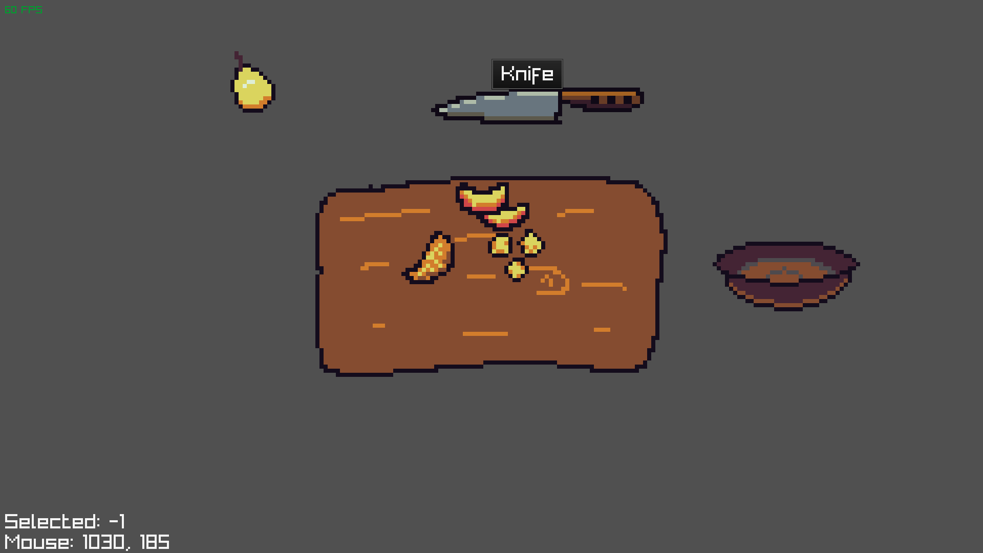 >>1039695 Сделали на стриме заготовочку. Нарисовали спрайтики, выбрали звуки, сделали возможность перетаскивать ингредиенты, класть их на доску и резать на кусочки.