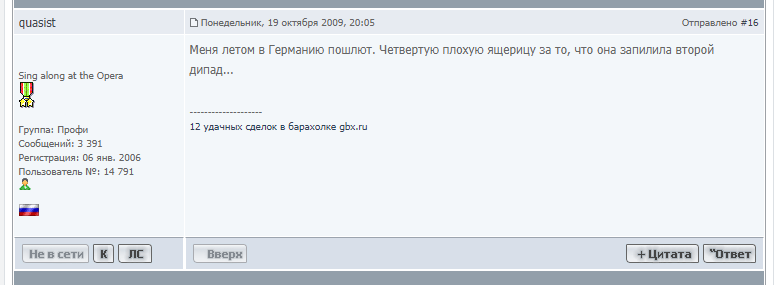 > В последнее время замечена странная тенденция - стоит Квазисту поучаствовать в каком-нибудь конкурсе, как с его организаторами случается нечто страшное. Вот, к примеру, поучаствовал он в Crap-овом компетишене, так там убилась страница с конкурсом, потом несколько раз убивался тематический чат, потом сайт совсем сдох > У организатора конкурса Анархи тут же сдох комп с результатами голосовалок. Однозначно, в ожидаемых вскоре конкурсах от GPH организаторам стоит задуматься над отдельным пунктом в правилах: > "Если ваш ник Quasist, то в целях безопасности ваше энтри не будет допущено на этот конкурс".