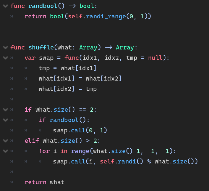 >>1048860 >ты хоть в строчку закопипастил код GDScript позволяет писать в строчку: >func f(): var a; while a: if a: call1(a); else: return a Но это не рекомендуется по очевидной причине.