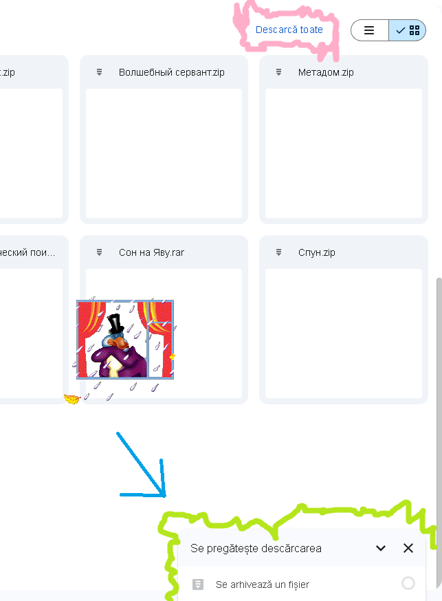 Как скачать: Сначала жмакаем на хуйню, которая обведена розовым, находится радом с переключение режима просмотра. Потом появится хуйня, выделенная зеленым и синей стрелкой. Ждать и сосать. Можно молиться. Если вы молились правильно, то минут через 10 вам дадут битый архив и вы сможете скачать его с разбивкой на несколько частей.