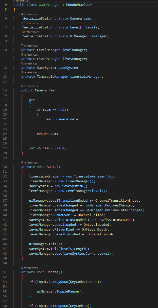 >>1042413 Есть GameManager, большинство остальных скриптов не существует на сцене, они обычные C# скрипты, он им кидает все нужные ссылки. Ни один нижний класс не знает о верхнем. Верхние подписаны на события нижних. Mono только там, где нужно прокидывать тейлы, партиклы и прочие юнити штуки. Где возможно, передаются просто интерфейсы.