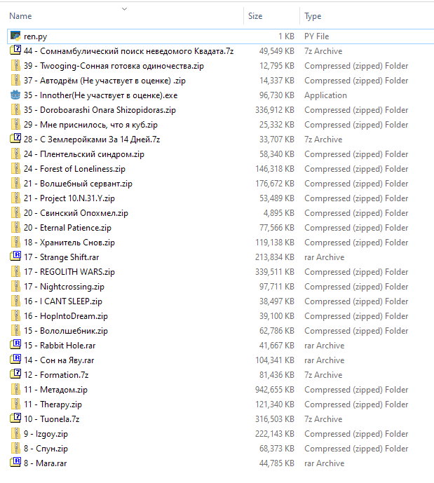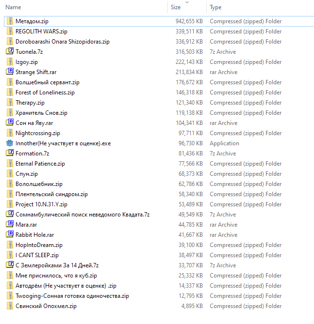 Doroboarashi Onara Shizopidoras Eternal Patience Forest of Loneliness Formation HopIntoDream I CANT SLEEP Innother(Не участвует в оценке) Izgoy Mara Nightcrossing Project 10.N.31.Y Rabbit Hole REGOLITH WARS Strange Shift Therapy Tuonela Twooging-Сонная готовка одиночества Автодрём (Не участвует в оценке) Вололшебник Волшебный сервант Метадом Мне приснилось, что я куб Плентельский синдром С Землеройками За 14 Дней Свинский Опохмел Сомнамбулический поиск неведомого Квадата Сон на Яву Спун Хранитель Снов