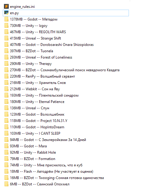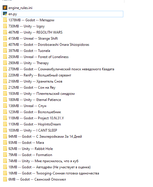 Отправка игры: 1. Игра отправляется на почту организатору. Отправляйте игру ссылкой на одно из облаков. ЯДиск, Google Drive, Mega, Dropbox или другие адекватные. Лучше всего Mega - бесплатные 20 Гб это круто! 2. Игра должна быть упакована в архив, желательно избежать применения инсталляторов. По названию архива должно быть понятно, что в нём за игра. 3. Вес игры не должен быть более 10 Гб. Билд игры не должен содержать лишнего неиспользуемого контента вроде папки из unity "do not ship", также по возможности используйте сжатие спрайтов/музыки. 4. Рекомендуется приложить к билду скриншоты вашей игры и обязательно сделать readme.