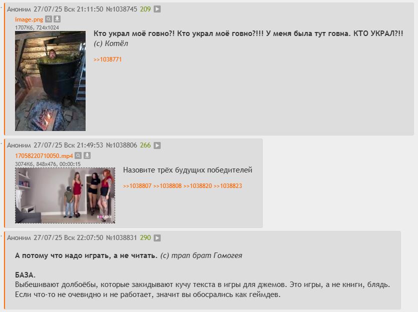 Кстати, вопрос ТВГЕшизам, а в чём ваша суть? Зачем вы всё это делаете, чем я вас так проткнул? Я понимаю что меня может не любить Гомогей, ведь это я прозвал его игру игрой про дверку от шкафа в раздевалке и начал стебать что он должен заменить дверку на аниметян. Кто-то это даже подхватил. Я понял бы если бы Ворюша обижался, ведь я его Ворюшей прозвал. Понял бы если бы Димасик обиделся, ведь видео с фоткой, где над ним смеются сделал я и поставил его в ОПпост треда Межсезонье. Понял бы обиду Распидора и Флешепидора. Даже Ёршика можно понять. Меньшим шизом и обиженным школьником его это не сделает, но можно понять что школьник мог так сильно обидеться что ему не дали его парашу рекламировать. Но вы то, блядь, с чего горите? Если вы не семенящие Распидор или Флешепидор, то вы ведь реальные шизы.