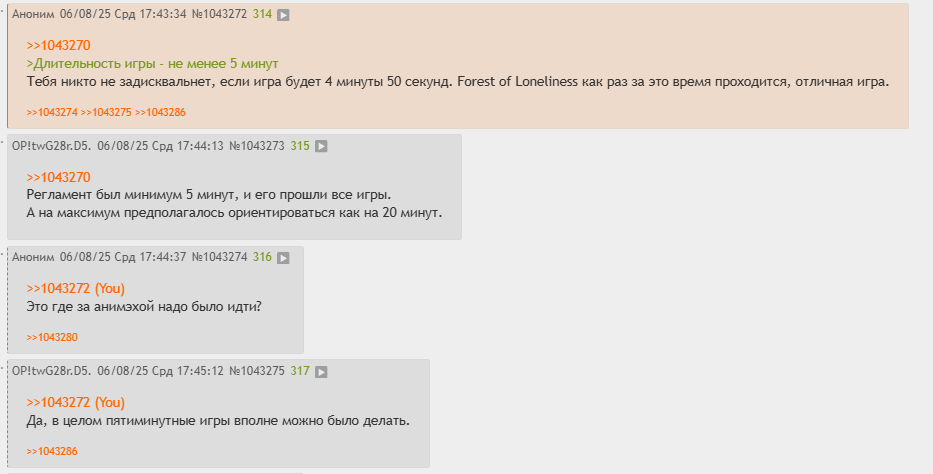 >>1043275 >>1043272 Пошло виляние жопой. Сначала >делайте игры на 20 минут >если тема будет упомянута только текстом, в одной катсцене или в сеттинге, то на участие в голосовании можете не рассчитывать А теперь называет пятиминутную игру с одной катсценой про сон хорошей. Я другого от него и не ожидал. А его предупреждал, но он спорил.