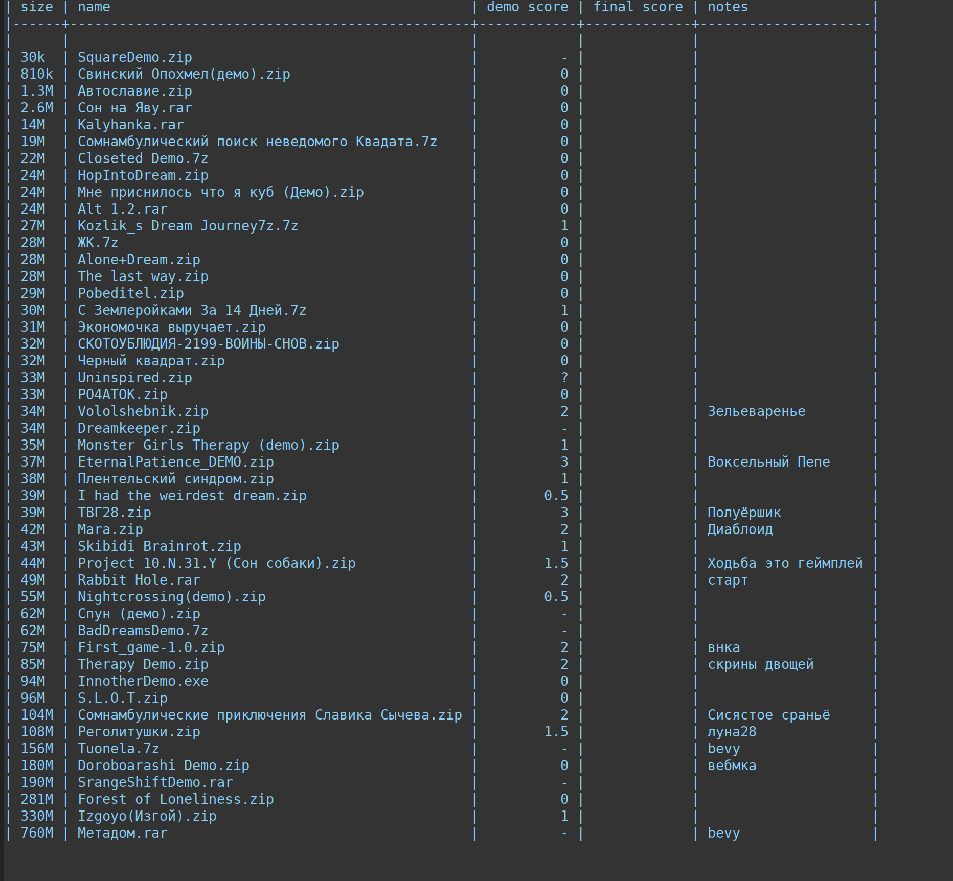 Успел поиграть вот в эти игры: Doroboarashi Onara Shizopidoras - вебмки - 20/2.5 Eternal Patience - лягушка - 30/4.5 Forest of Loneliness - лес - 26/4 Formation - космос - 24/3.5 HopIntoDream - метла - 21/5 I CANT SLEEP - надо уснуть - 25/5 Innother(Не участвует в оценке) - две девочки на диване - 15/1 Izgoy - выживач на острове - 22/3 Mara - слешер - 30/5 Nightcrossing - макс - 13/5 Project 10.N.31.Y - марсианин - 35/5 Rabbit Hole - фембои - 29/4 REGOLITH WARS - луноход - 25/2 StrangeShift - феназепам - 29/5 Therapy - платформер про сны - 28/5 Tuonela - стрелялка в пещерах - 27/2