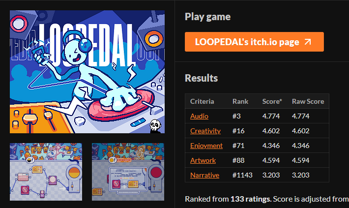 >>1044468 → Ты не туда смотришь, у финалистов по 100 комментариев и ещё больше оценок. В среднем на одного участника - 20 оценок, медиана ещё не высчитана итчом... Ахуй, реально у гриба (rate/3778087) хуй да нихуя комментов и оценок, а он топ-1 по креативности и в остальных категориях топ-10. Значит ты туда смотришь. Да оценки это что-то жёсткое, кто-то в самой середине списка, а игры казались неплохими, за некоторых особенно обидно. Есть немало интересных сочетаний, которые нужно посмотреть: кто-то занял первые места по наративу и по звуку одновременно, у кого-то "гоночка" с сюжетом, или вот, кидал вчера про цветного диджея, она в топе https://itch.io/jam/gmtk-2025/rate/3775169