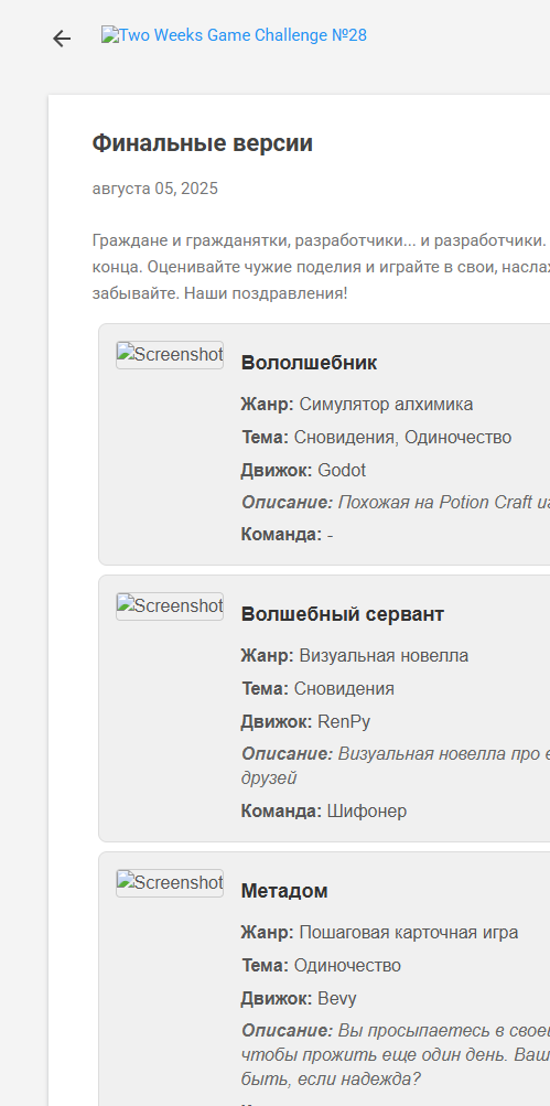 ГОЛОГЕЙМС читает тред? Нужно его мнение по поводу разных вещей, которые он ранее игнорил в тредах: 1) того, что серега засрал поиск по запросу "two weeks game" своим одноименным высером в стиме 2) юридический вопрос - по поводу того, что создание архивов игр конкурса незаконно, потому что авторы не давали на это право (до этого конкурса) 3) некомпетентность школьника-организатора, который неделю не мог оформить пост с финалками, и позвал в судьи своих одноклассников