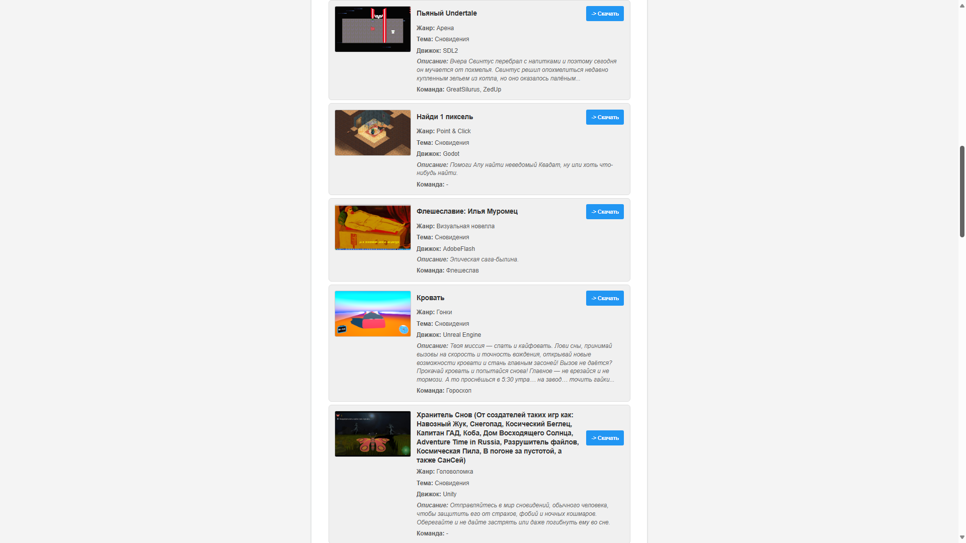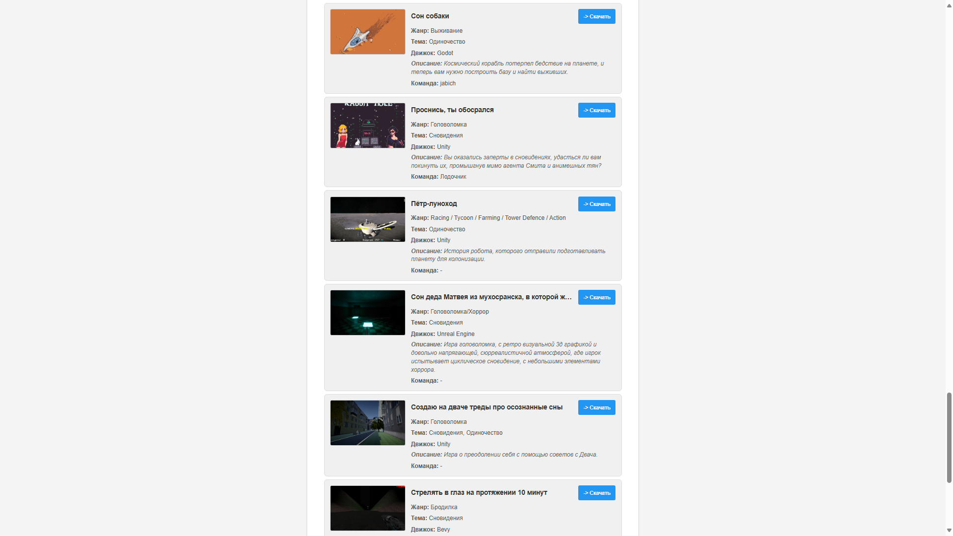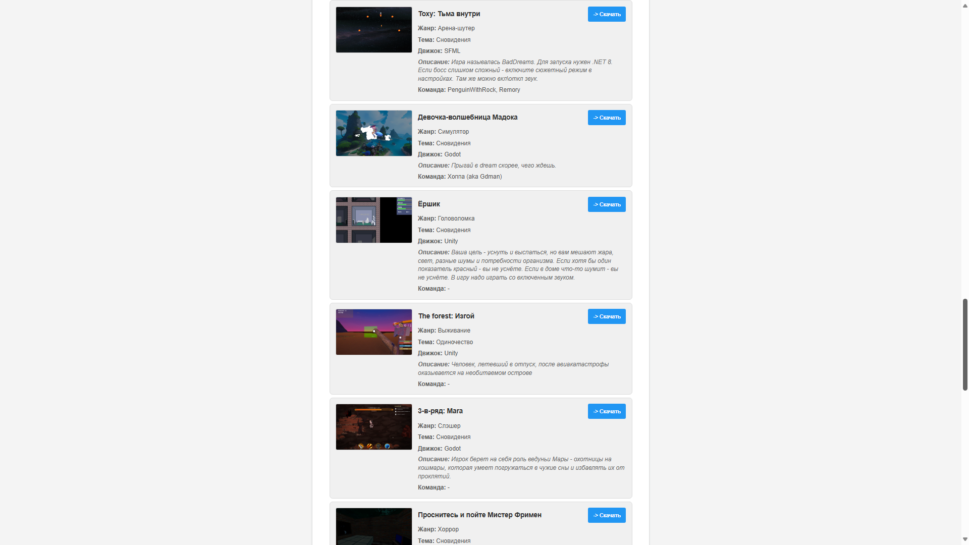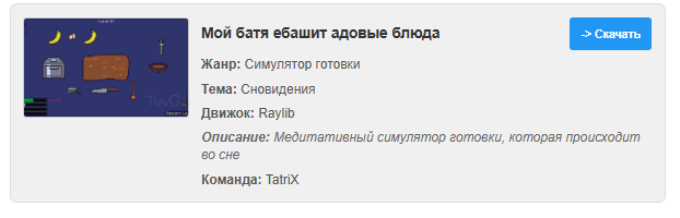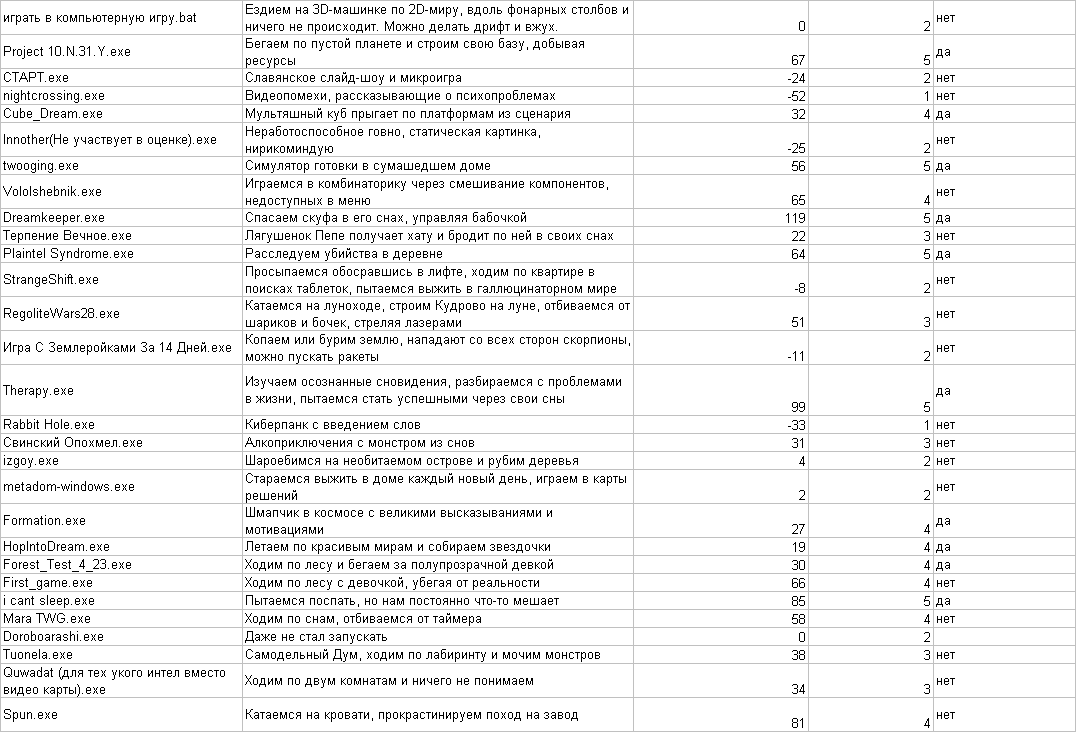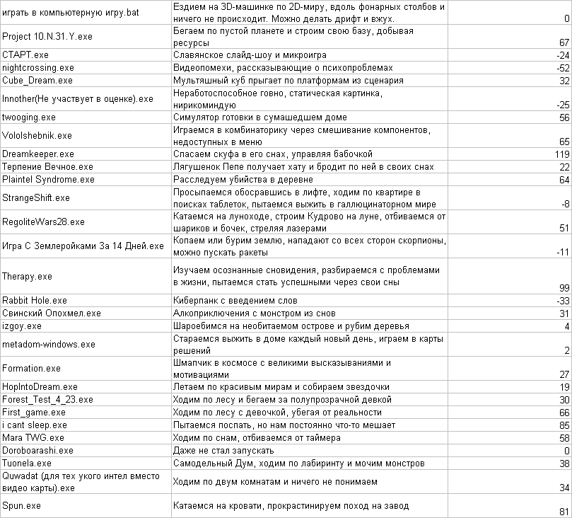 играть в компьютерную игру.batЕздием на 3D-машинке по 2D-миру, вдоль фонарных столбов и ничего не происходит. Можно делать дрифт и вжух.0 Project 10.N.31.Y.exeБегаем по пустой планете и строим свою базу, добывая ресурсы67 CTAPT.exeСлавянское слайд-шоу и микроигра-24 nightcrossing.exeВидеопомехи, рассказывающие о психопроблемах-52 Cube_Dream.exeМультяшный куб прыгает по платформам из сценария32 Innother(Не участвует в оценке).exeНеработоспособное говно, статическая картинка, нирикоминдую-25 twooging.exeСимулятор готовки в сумашедшем доме56 Vololshebnik.exeИграемся в комбинаторику через смешивание компонентов, недоступных в меню65 Dreamkeeper.exeСпасаем скуфа в его снах, управляя бабочкой119 Терпение Вечное.exeЛягушенок Пепе получает хату и бродит по ней в своих снах22 Plaintel Syndrome.exeРасследуем убийства в деревне64 StrangeShift.exeПросыпаемся обосравшись в лифте, ходим по квартире в поисках таблеток, пытаемся выжить в галлюцинаторном мире-8 RegoliteWars28.exeКатаемся на луноходе, строим Кудрово на луне, отбиваемся от шариков и бочек, стреляя лазерами51 Игра С Землеройками За 14 Дней.exeКопаем или бурим землю, нападают со всех сторон скорпионы, можно пускать ракеты-11 Therapy.exeИзучаем осознанные сновидения, разбираемся с проблемами в жизни, пытаемся стать успешными через свои сны99 Rabbit Hole.exeКиберпанк с введением слов-33 Свинский Опохмел.exeАлкоприключения с монстром из снов31 izgoy.exeШароебимся на необитаемом острове и рубим деревья4 metadom-windows.exeСтараемся выжить в доме каждый новый день, играем в карты решений2 Formation.exeШмапчик в космосе с великими высказываниями и мотивациями27 HopIntoDream.exeЛетаем по красивым мирам и собираем звездочки19 Forest_Test_4_23.exeХодим по лесу и бегаем за полупрозрачной девкой30 First_game.exeХодим по лесу с девочкой, убегая от реальности66 i cant sleep.exeПытаемся поспать, но нам постоянно что-то мешает85 Mara TWG.exeХодим по снам, отбиваемся от таймера58 Doroboarashi.exeДаже не стал запускать0 Tuonela.exeСамодельный Дум, ходим по лабиринту и мочим монстров38 Quwadat (для тех укого интел вместо видео карты).exeХодим по двум комнатам и ничего не понимаем34 Spun.exeКатаемся на кровати, прокрастинируем поход на завод81