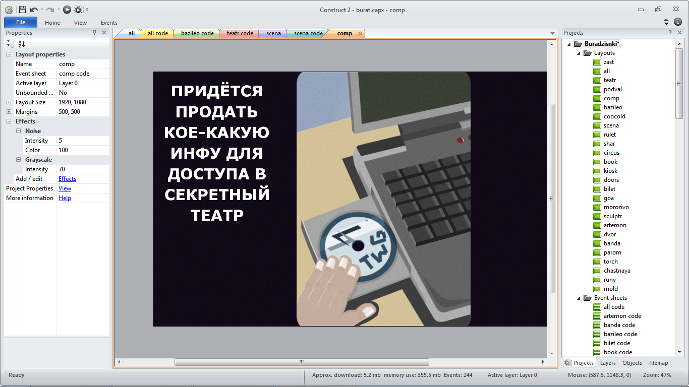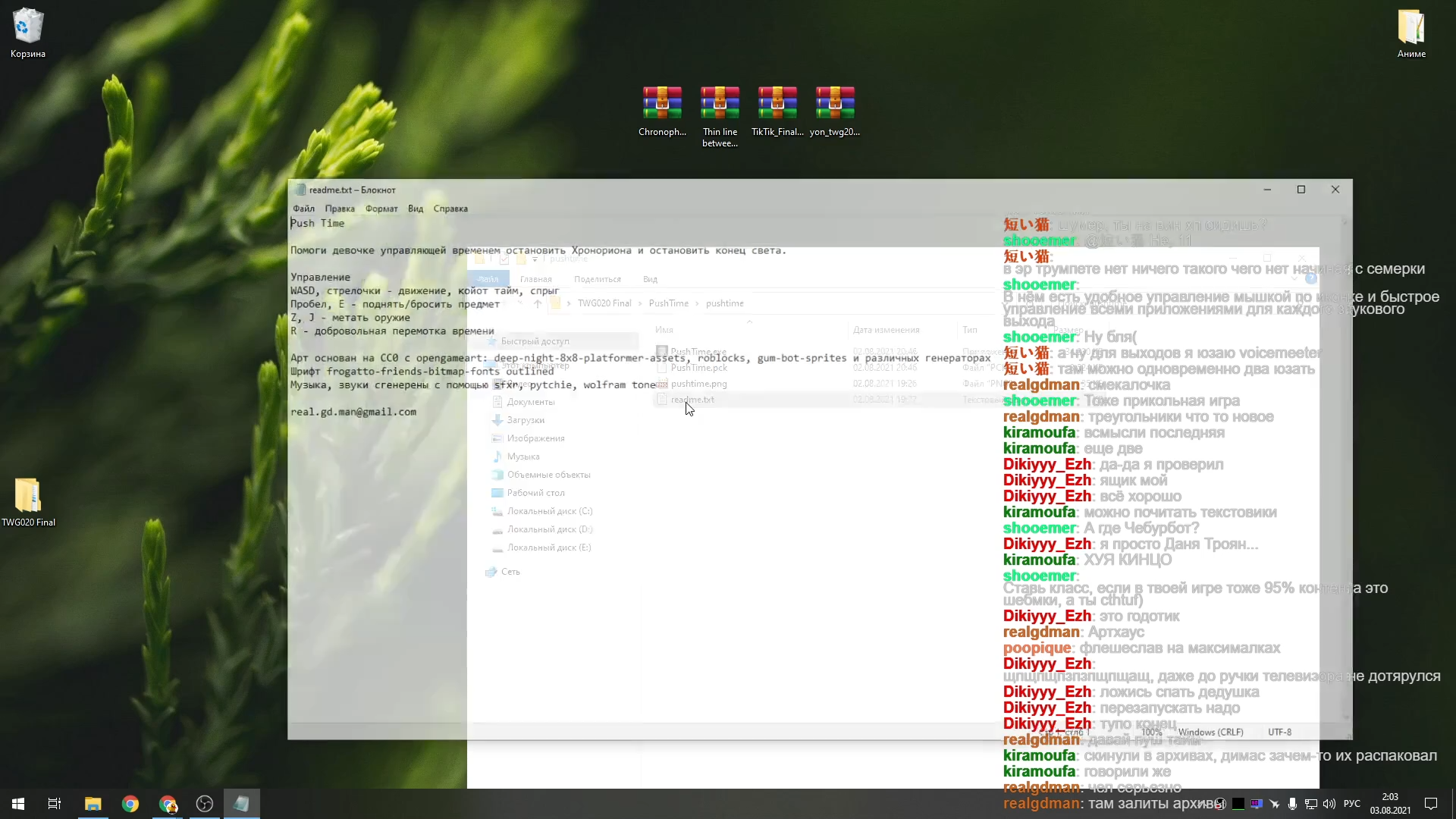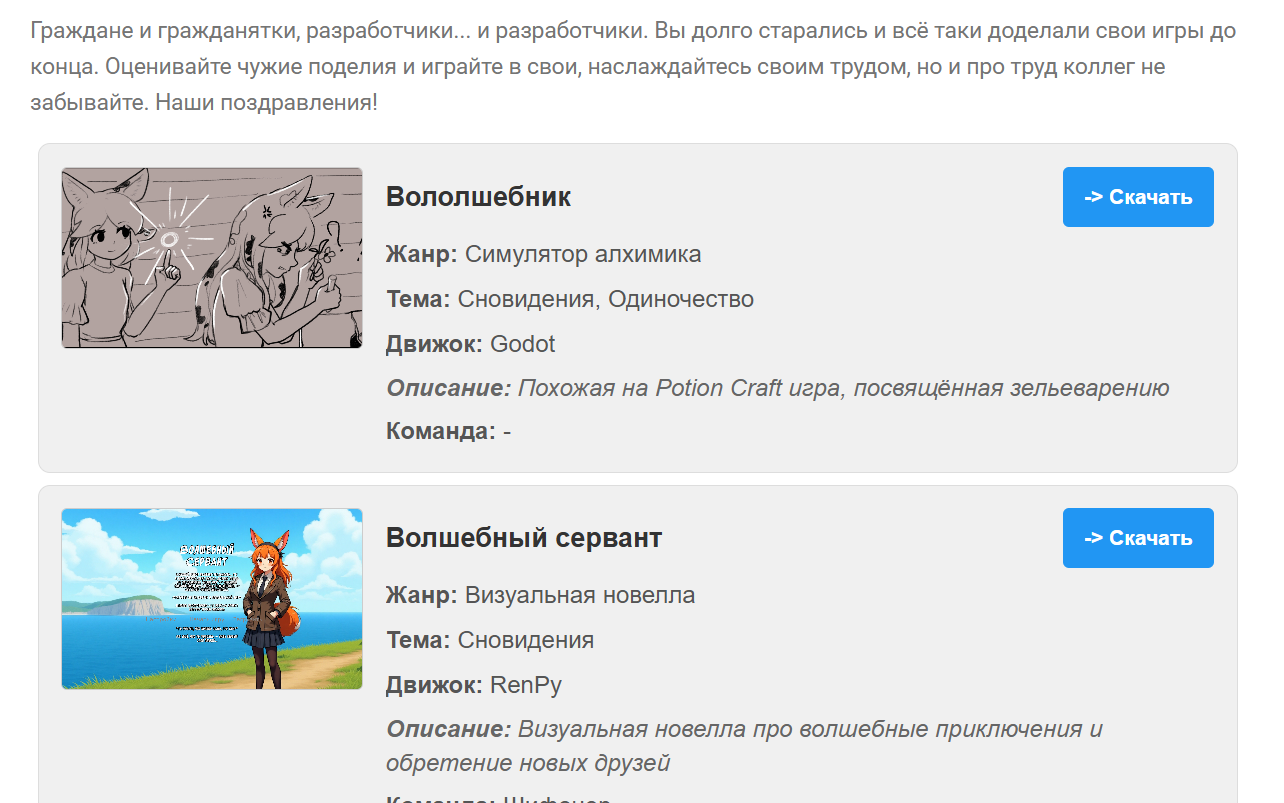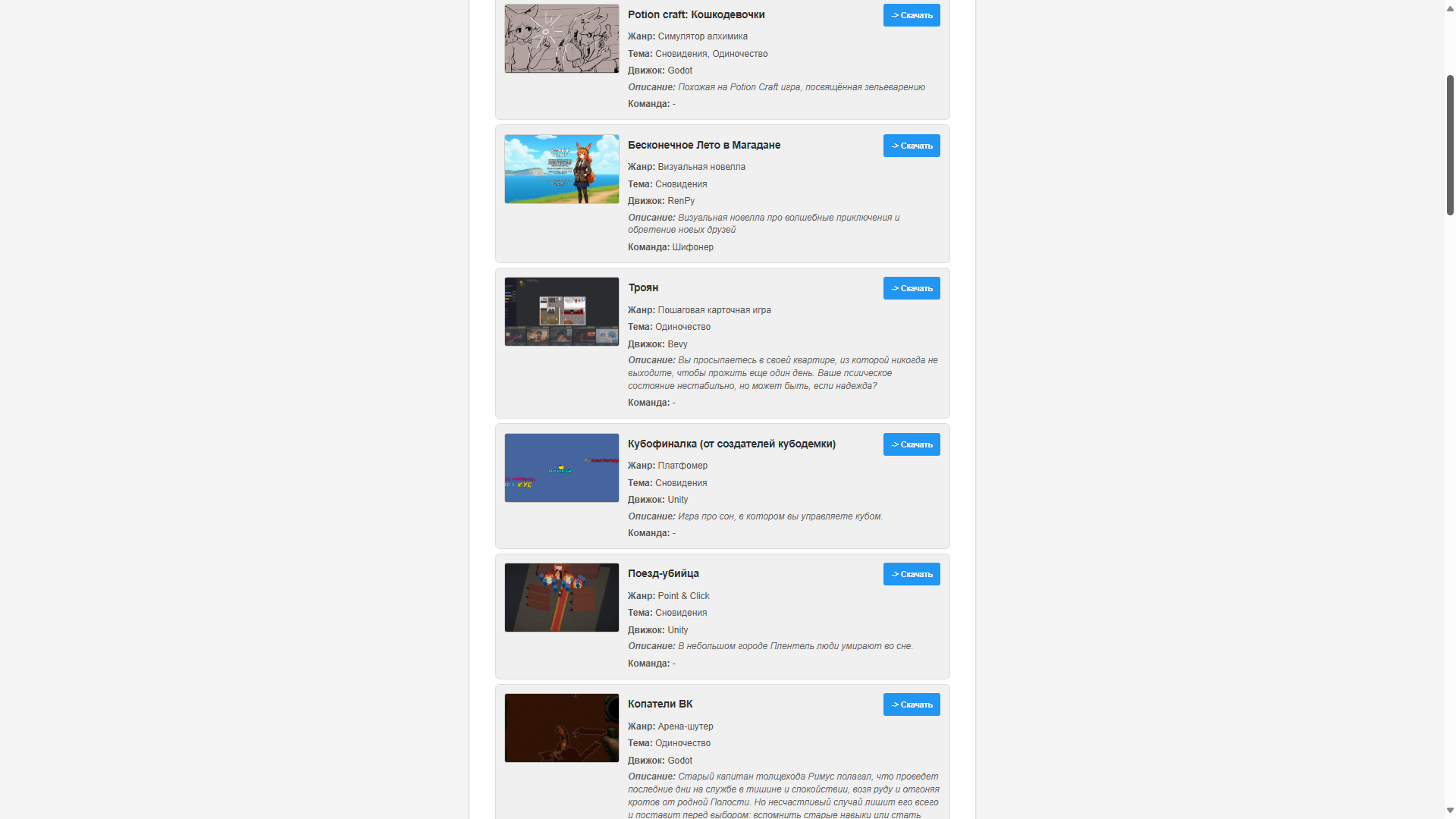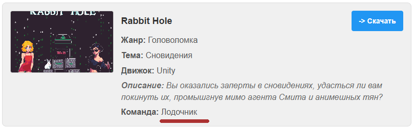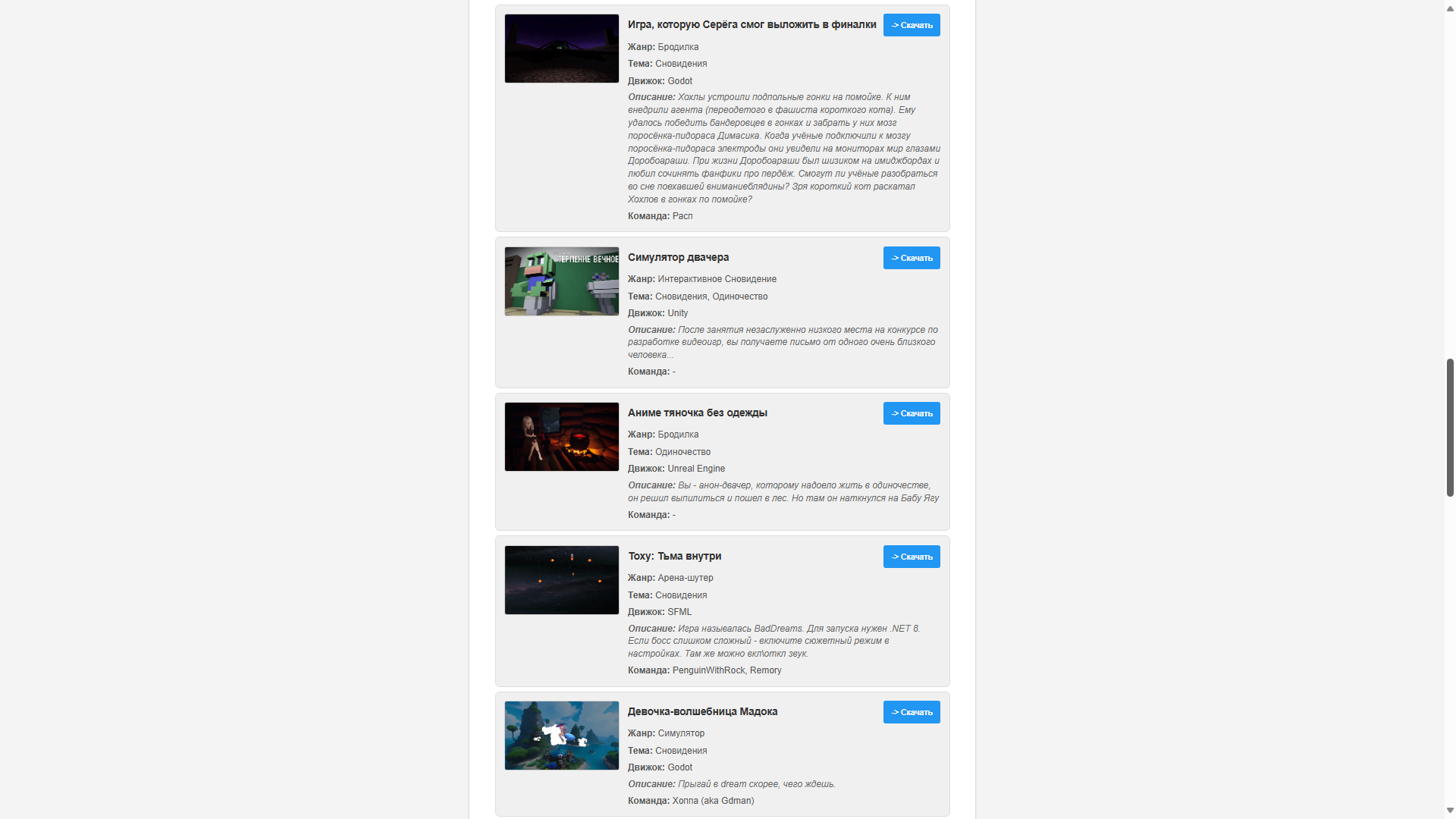 играть в компьютерную игру.batЕздием на 3D-машинке по 2D-миру, вдоль фонарных столбов и ничего не происходит. Можно делать дрифт и вжух.0 Project 10.N.31.Y.exeБегаем по пустой планете и строим свою базу, добывая ресурсы67 CTAPT.exeСлавянское слайд-шоу и микроигра-24 nightcrossing.exeВидеопомехи, рассказывающие о психопроблемах-52 Cube_Dream.exeМультяшный куб прыгает по платформам из сценария32 Innother(Не участвует в оценке).exeНеработоспособное говно, статическая картинка, нирикоминдую-25 twooging.exeСимулятор готовки в сумашедшем доме56 Vololshebnik.exeИграемся в комбинаторику через смешивание компонентов, недоступных в меню65 Dreamkeeper.exeСпасаем скуфа в его снах, управляя бабочкой119 Терпение Вечное.exeЛягушенок Пепе получает хату и бродит по ней в своих снах22 Plaintel Syndrome.exeРасследуем убийства в деревне64 StrangeShift.exeПросыпаемся обосравшись в лифте, ходим по квартире в поисках таблеток, пытаемся выжить в галлюцинаторном мире-8 RegoliteWars28.exeКатаемся на луноходе, строим Кудрово на луне, отбиваемся от шариков и бочек, стреляя лазерами51 Игра С Землеройками За 14 Дней.exeКопаем или бурим землю, нападают со всех сторон скорпионы, можно пускать ракеты-11 Therapy.exeИзучаем осознанные сновидения, разбираемся с проблемами в жизни, пытаемся стать успешными через свои сны99 Rabbit Hole.exeКиберпанк с введением слов-33 Свинский Опохмел.exeАлкоприключения с монстром из снов31 izgoy.exeШароебимся на необитаемом острове и рубим деревья4 metadom-windows.exeСтараемся выжить в доме каждый новый день, играем в карты решений2 Formation.exeШмапчик в космосе с великими высказываниями и мотивациями27 HopIntoDream.exeЛетаем по красивым мирам и собираем звездочки19 Forest_Test_4_23.exeХодим по лесу и бегаем за полупрозрачной девкой30 First_game.exeХодим по лесу с девочкой, убегая от реальности66 i cant sleep.exeПытаемся поспать, но нам постоянно что-то мешает85 Mara TWG.exeХодим по снам, отбиваемся от таймера58 Doroboarashi.exeДаже не стал запускать0 Tuonela.exeСамодельный Дум, ходим по лабиринту и мочим монстров38 Quwadat (для тех укого интел вместо видео карты).exeХодим по двум комнатам и ничего не понимаем34 Spun.exeКатаемся на кровати, прокрастинируем поход на завод81
