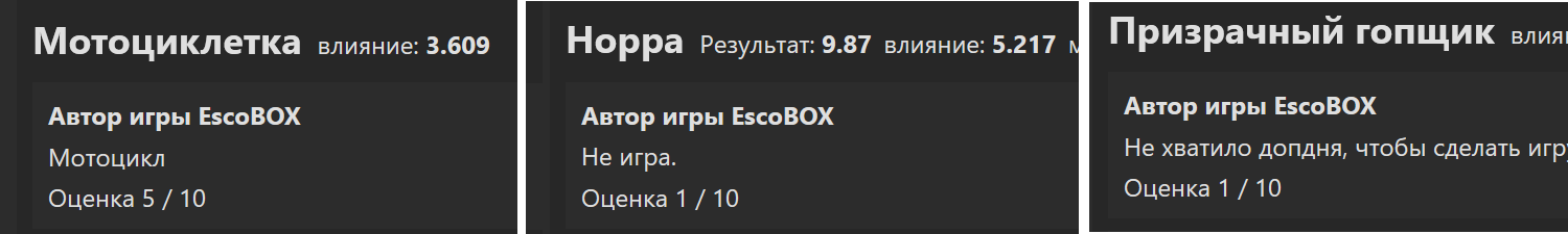До сих пор не глянул свои места. По стате, оценил 23 игры, получил 37 оценок, 29 комментов. Глянул оценки. Ну, по графону перебор, по енжою обосрался, походу, в том числе из-за отсутствия дельтатайма. Такой вот опыт. А финальная версия по гмтк-рате-378265.