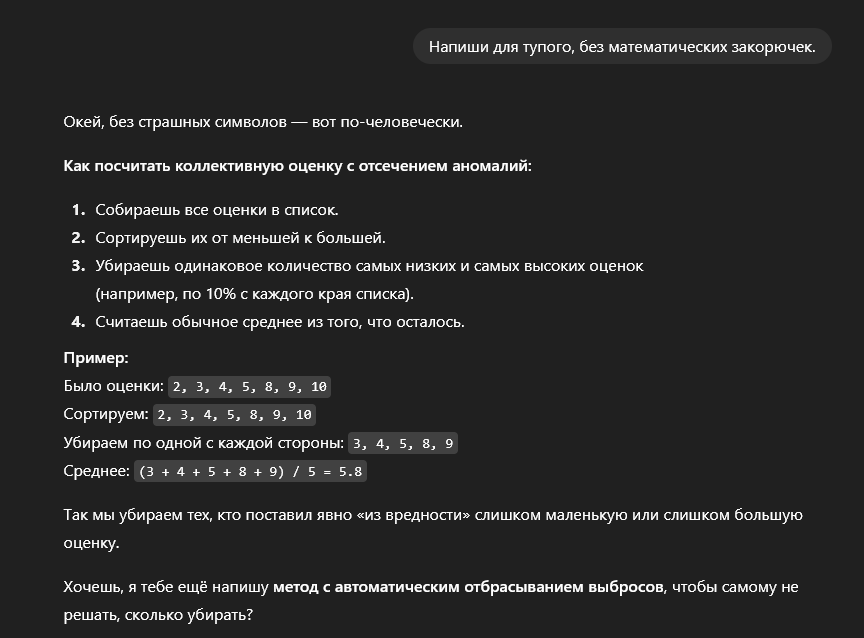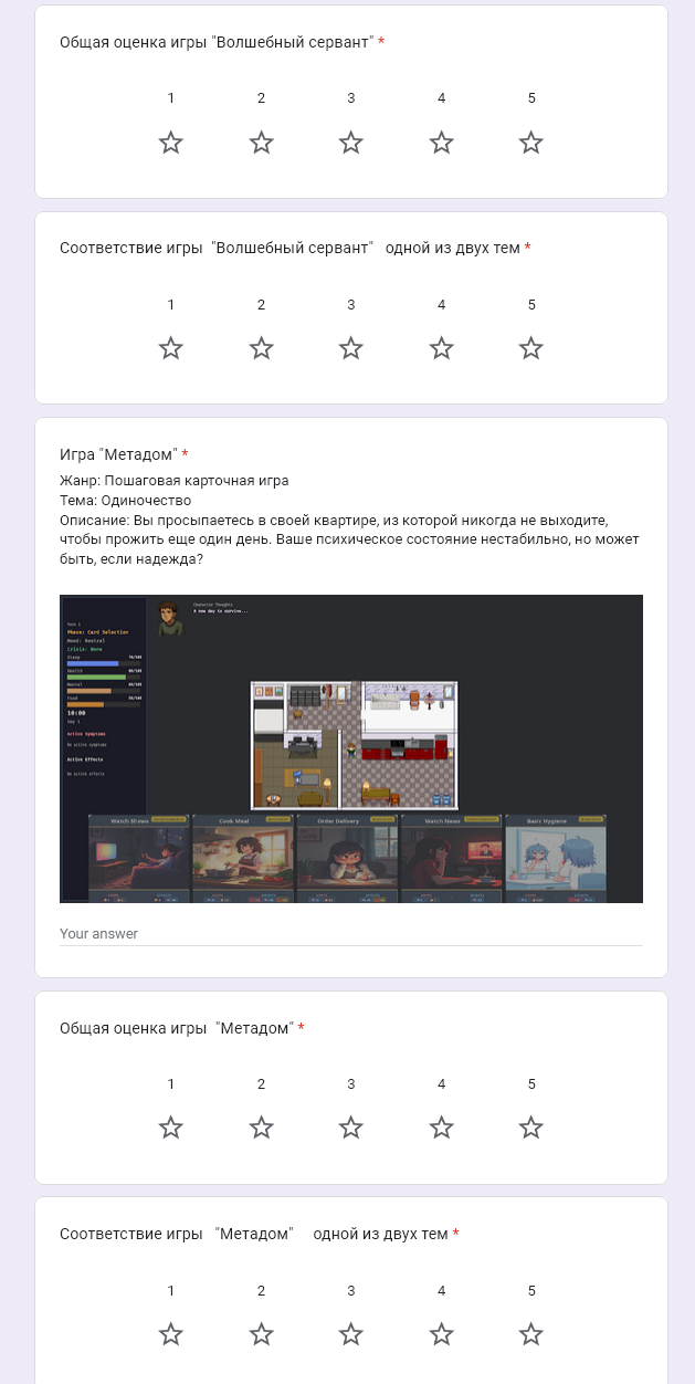 Но если ты имел в виду аллегорию, то соответствие теме должно иметь значение, да. В будущем придумаю как это по другому учесть. Сейчас всё равно получилось неидеально, многие участники голосуют на отъебись, отчего за процессом голосования нету особого контроля. Так что в будущем думаю уменьшить кол-во судей (да, некоторых буквально подрядили на это дело и их энтузиазм низкий), убрать голосование участников, поскольку как я вижу многим из них не хочется голосовать а хочется лишь делать игры и т.д.