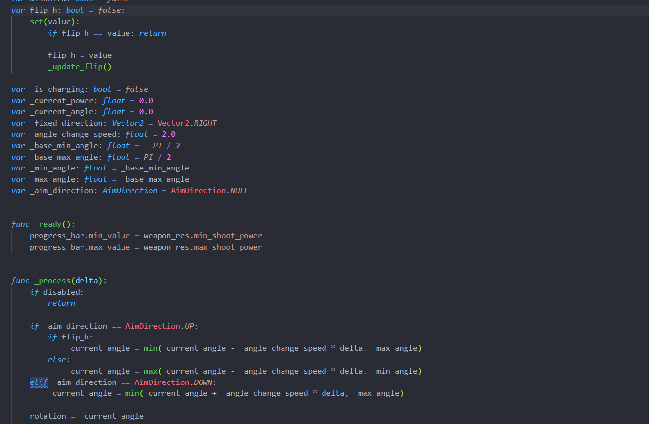 >>1052441 Это игра а-ля червяки классические, я хочу чтобы при использовании кнопок оружие наводилось вверх/вниз, собственно я это уже реализовал для "обычного" поведения (когда перс смотрит вправо) хочу сделать то же самое когда он смотрит влево