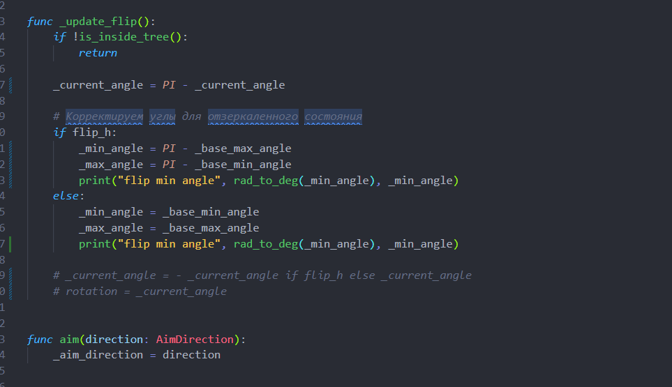 >>1052437 >>1052454 Не, падажжи, у тебя какая-то ерунда. Ты целишься мышкой же? Мышка тебе уже даёт точку на виртуальном круге, относительно которой ты должен посчитать угол и, если, по пикче >>1051815, у тебя 2 или 3 сектор, то у тебя моделька флипается. Флип модельки должен быть второстепенен. А судя по коду ты сначала флипаешь модельку, а потом из её флипа пытаешься логику развивать.