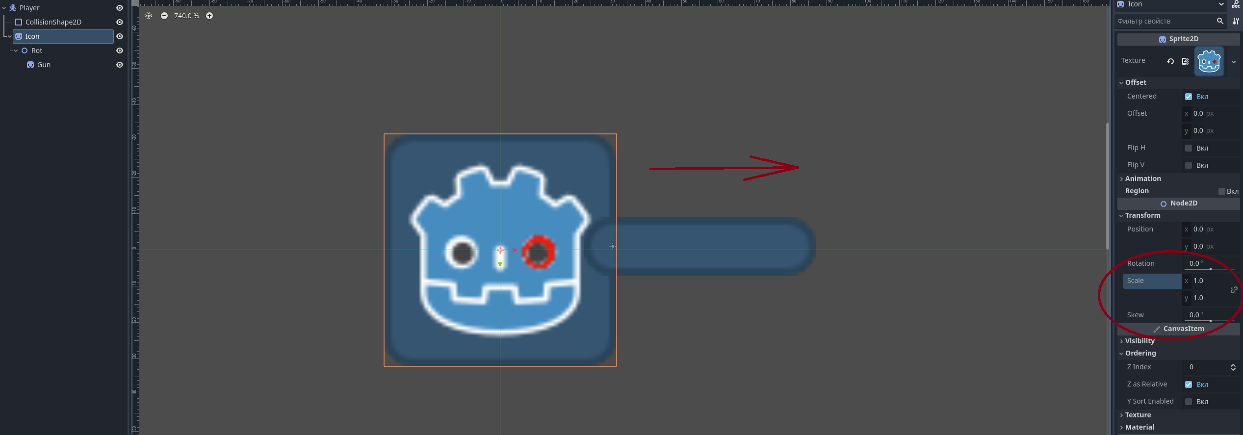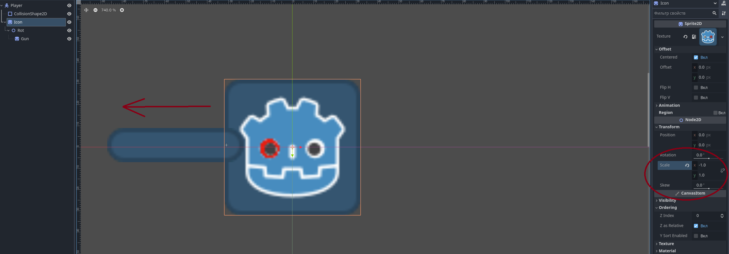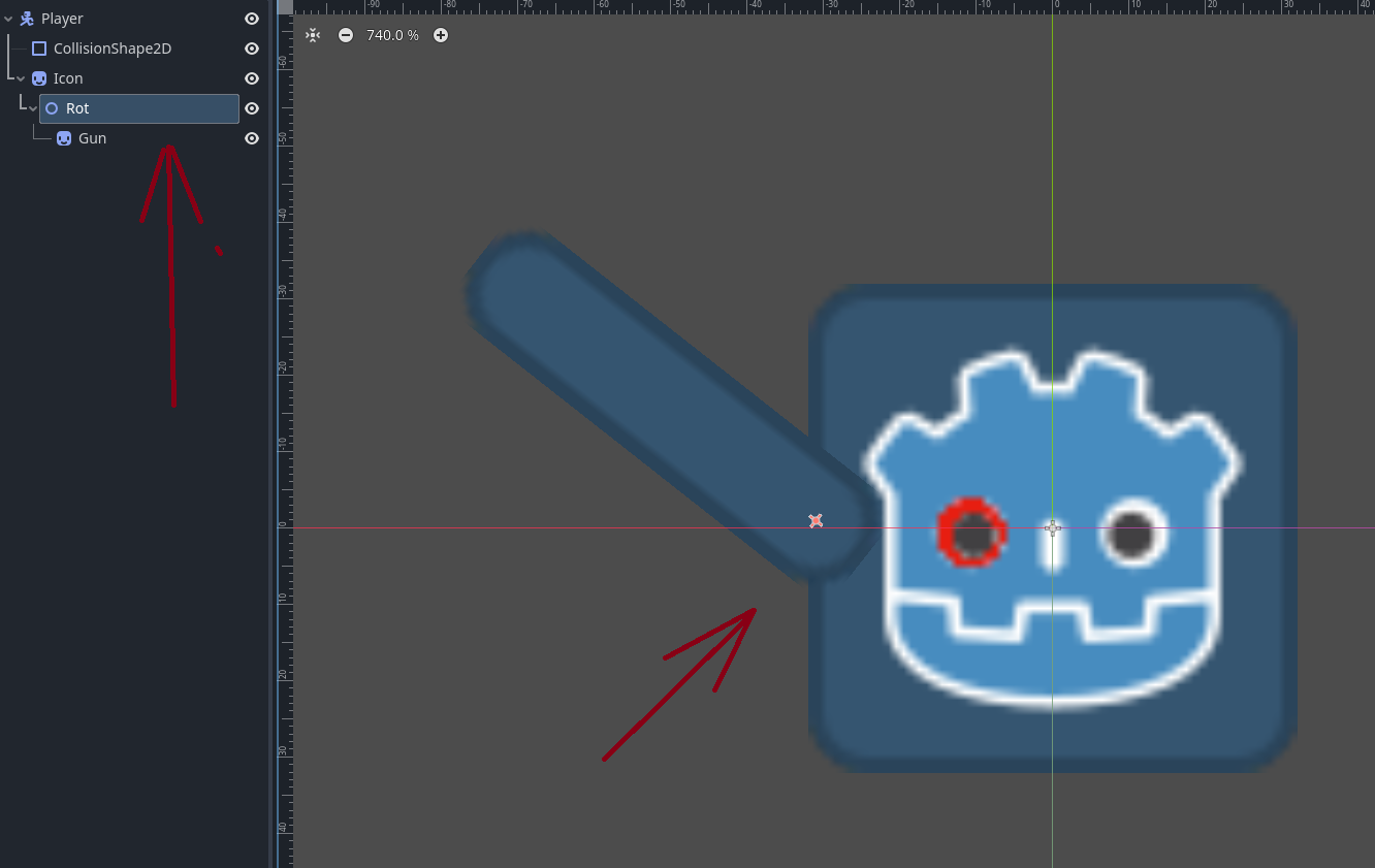 >>1052469 >>1052463 Значит, начать надо с того, что использовать не flip_h, а transform.scale.x +/-1 и выстроить нодами привязки оружия к персу. Пикрелейтеды 1 и 2. Красный глаз у годобота чтобы видеть отражение по оси икс.