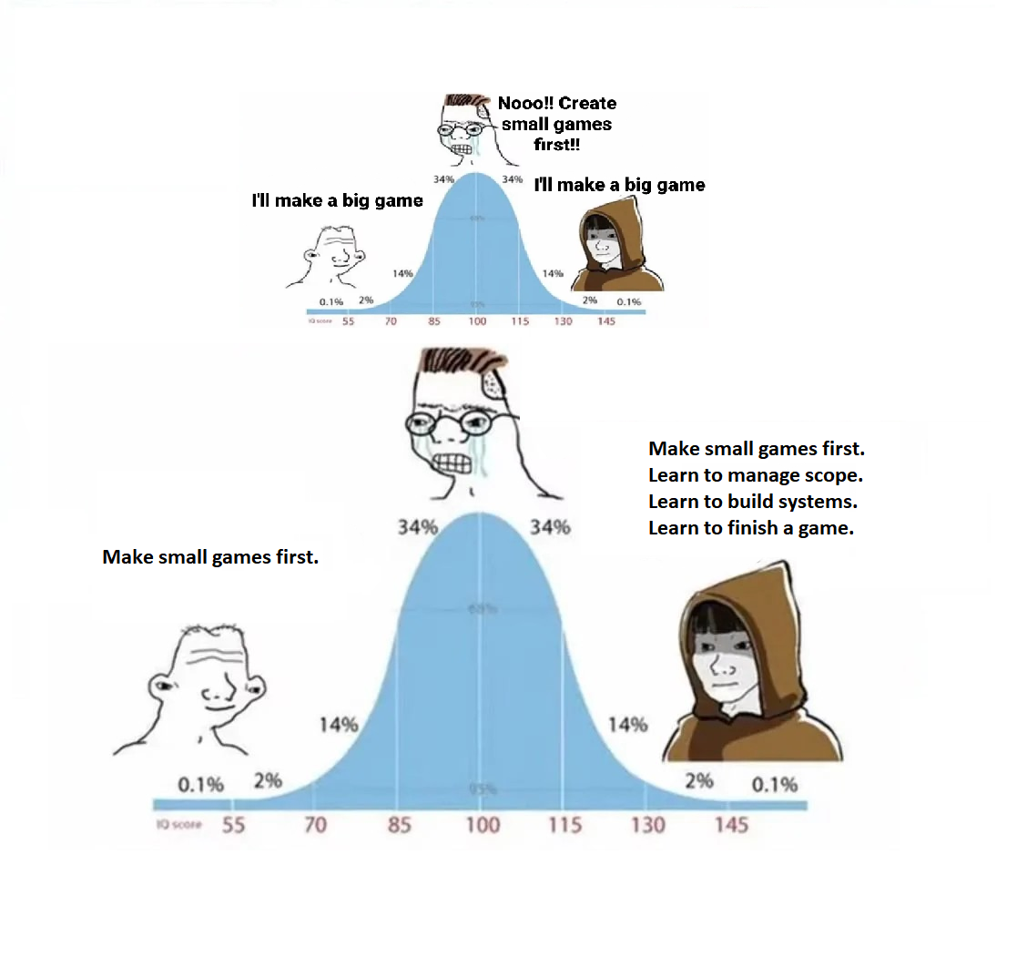 >>1054104 >пиксельный Обосрёшься с пиксель-артом - он не так прост, как кажется. >рогалик Обосрёшься с генерацией карт - это сложнее статичных карт. >данж-кравлер Обосрёшься с клаустрофобии, пока будешь тестировать игру. >в фентези сеттинге Обосрёшься с банальными клише дворфов-эльфов-гоблинов. >чтобы с шутками про пиво Обосрёшься с пропагандой нездорового образа жизни в игре. >подводные Обосрёшься с жидкостями и плаванием в 2D с видом сверху. >Хочу сделать Обосрёшься с желанием делать игру - быстро перехочется.