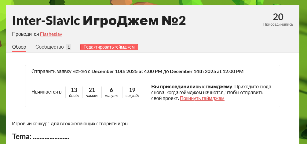лень преодолею и заработаю на призы для осенне-зимнего тдг (или задонатят 2-3 тр ктонибудь) https://itch.io/jam/inter-slavic-2 10 декабря старт