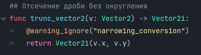 >Какие потери? Там между векторами нет преобразования, или зачем тогда я писал "обрезатель" без округления (пик) var a:int = 999999999999 var b: Vector2i = Vector2i(a,a) print(b) простыми словами a:int это a:int64 тогда как b это Vector2i(int32, int32)