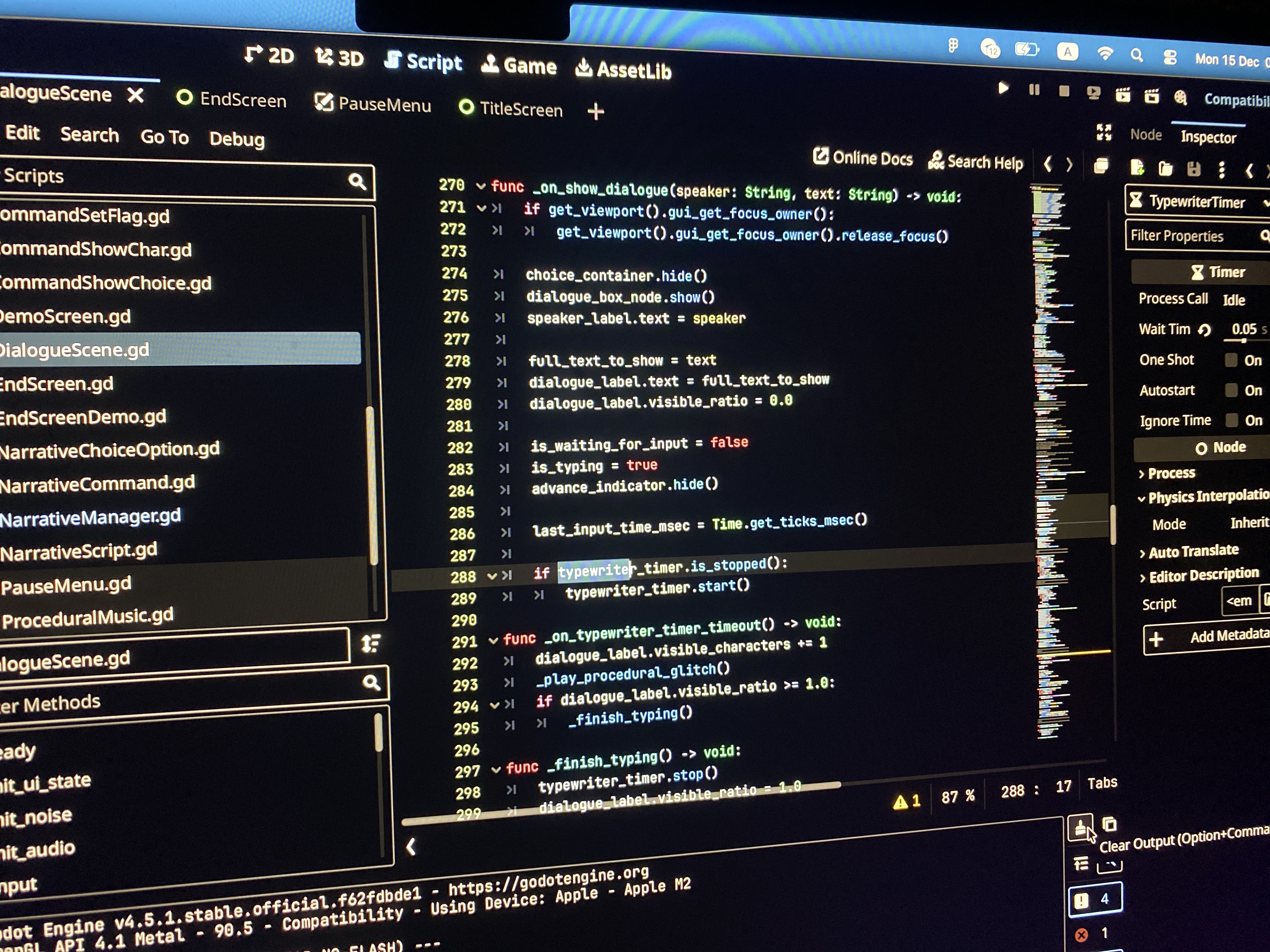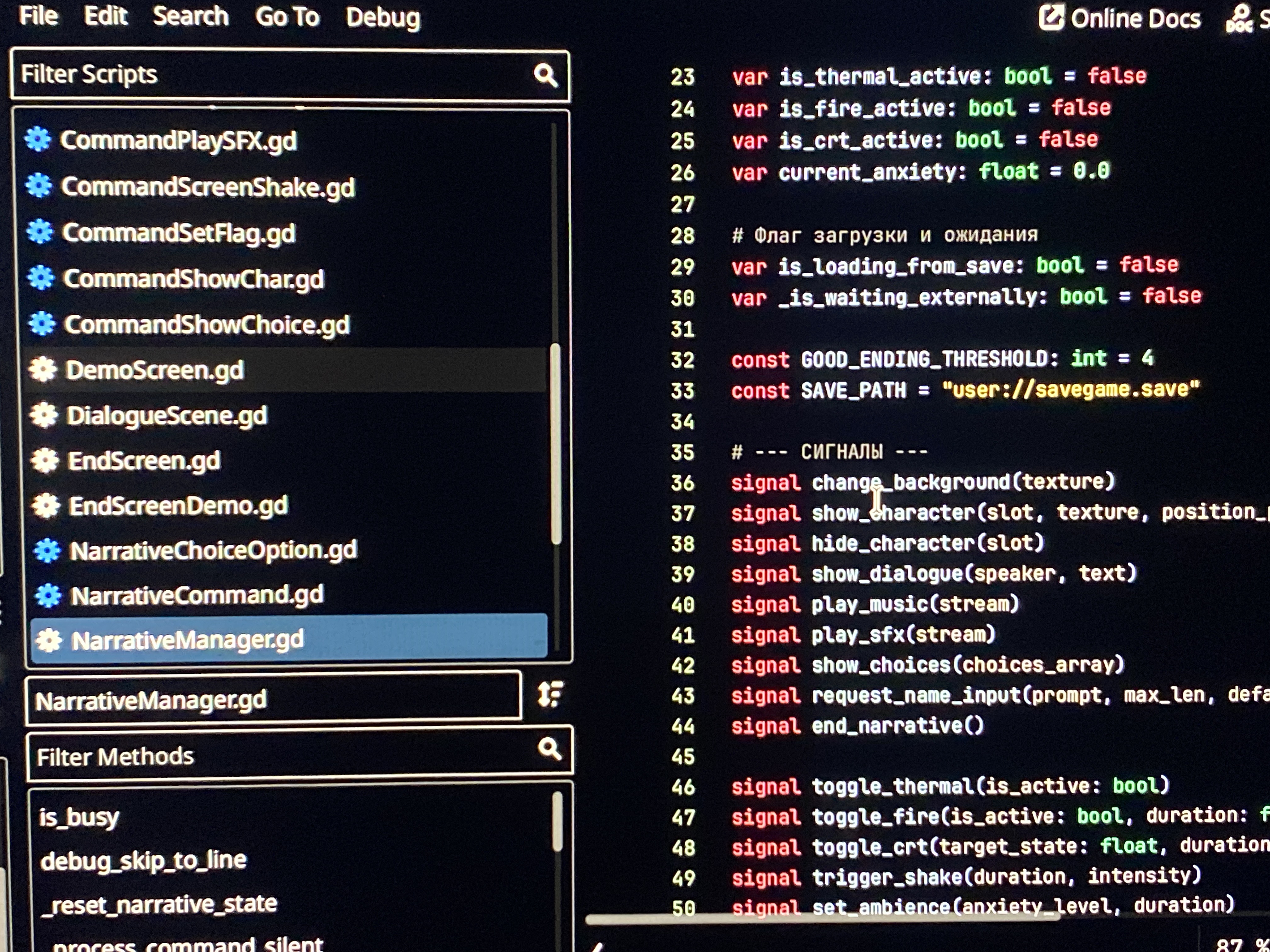 >>1064945 Да таймер это самое нежное, что из ебки тут было. Все начиналось тоже с линейных диалогов. Это сделал за вечер. Новелла как промо к основной игре. Потом мне сказали что линейная новелла на 15 минут хуета. Ну и в итоге появились и концовки, и сторипоинты и тепловизоры и шейдеры огня и ANXIETY LEVEL где сгенерированный голосом звук усиливает писк в ушах во время стресса Ебал я эту разработку короче. Надо было на Юнити из готовых ассетов хоррор бродилки с записками делать