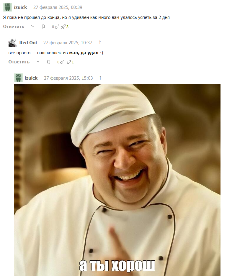 > Вместо того, чтобы делать игры, вы тут тратите лучшие годы на кубодемки ради ложного ощущения достижений. Делаете игры вместо делания игр? Ты еблан? Демка на конкурс в которую кто-то поиграет это отличное достижение и отличный старт. Даже не отличный - а лучший - ты ведь игры делаешь, чтобы в них кто-то поиграл - и вот конкурс это как раз оно, это в разы серьезнее чем дать поиграть другу, но при этом еще намного проще чем релизить игру.