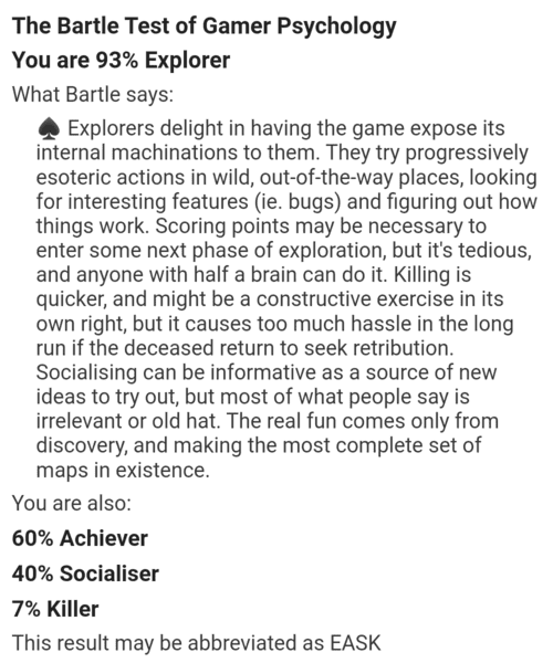 Другими словами: >Explorer - понять, как устроен мир. - животное в поиске чего-то нового в окружении. >Achiever - достичь целей в мире. - животное пытается выработать новые навыки. >Socialiser - общаться с людьми. - животное налаживает свои социальные связи. >Killer - доминировать. - животное стремится подняться в иерархии стаи.