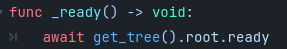В общем, годот сохраняет порядок вызовов цепочки await. И если вы пришли с "нормального" программирования - знайте это (не поломаете порядок при await get_parent.ready[/b) https://github.com/godotengine/godot-docs/issues/8478