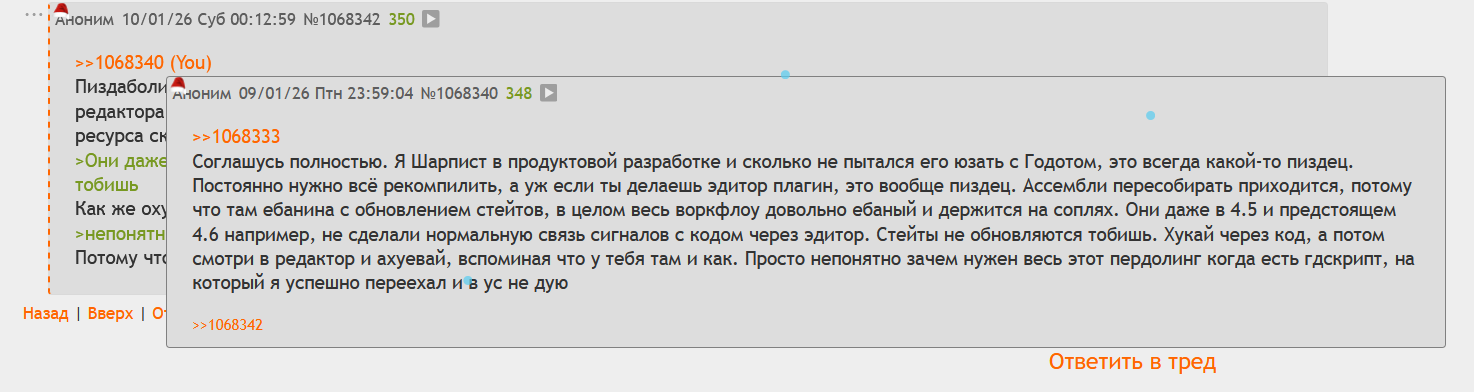 >>1066953 Я всегда импульсивен и графоманю. Я туплю и ошибаюсь как и все, тем более геймдев для меня новое. Иногда в споре рождается интересная мысль, но в целом уже не тот возраст чтобы самоутверждаться "в чатиках". Я больше хотел донести идею, чем то что я прав или не прав (кому не пофиг на анонимном форуме).