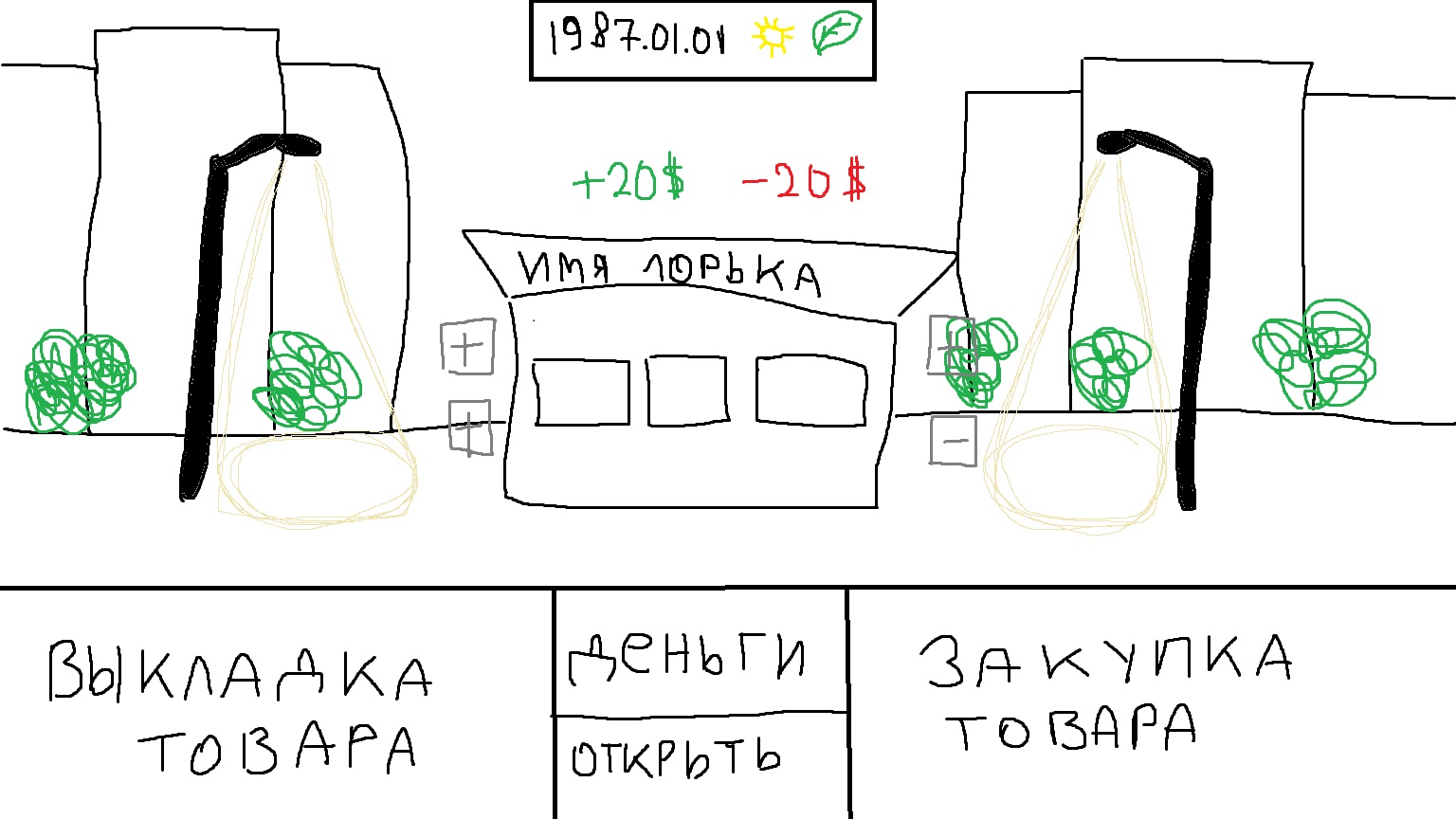 Доброго времени суток, как вам идея создать игру про ларек в период времени 1987 - 2000. По игровой механике следующее: