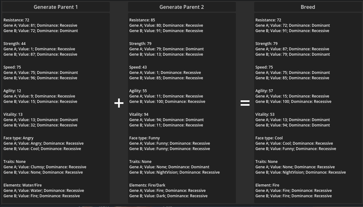 >>1072198 Решил сделать игру про генетику, написал простенький код генерации существ и их скрещивание, в целом работает как надо. Начну работать над геймплеем.